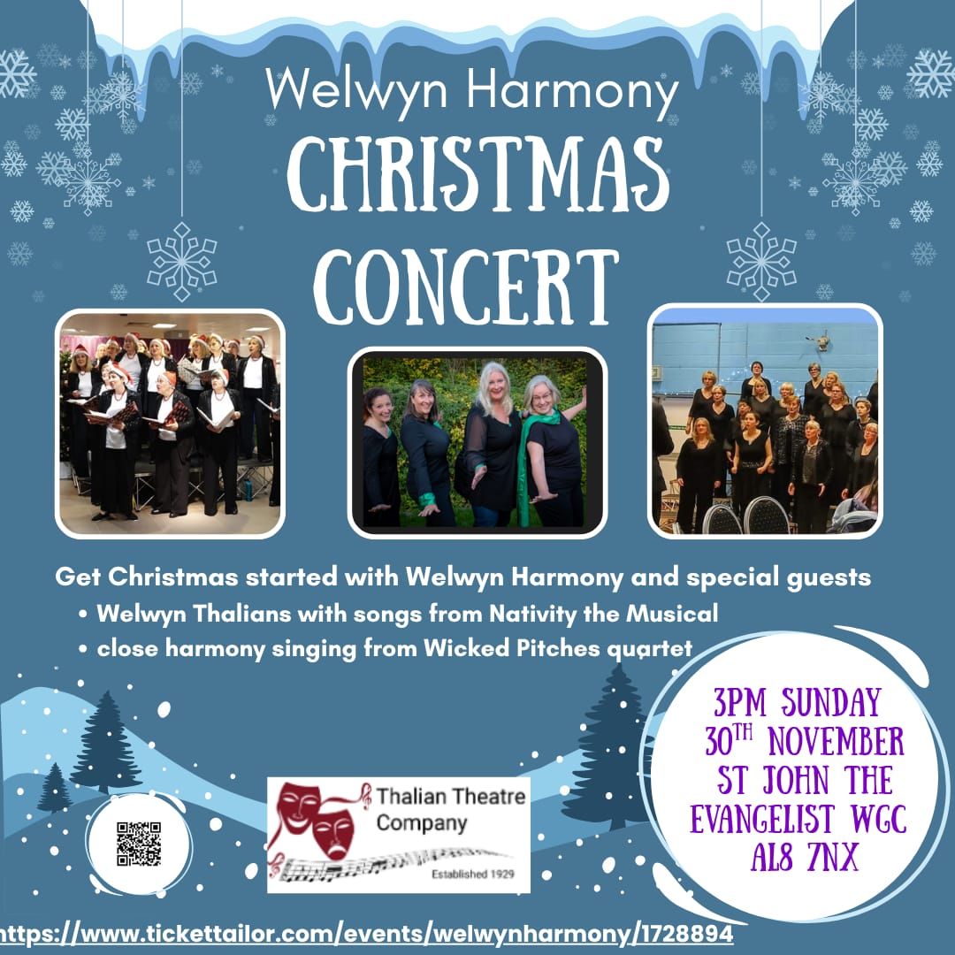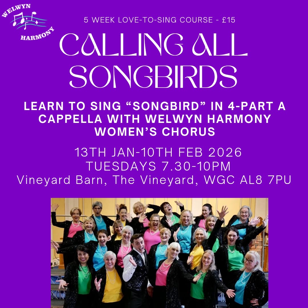 We're an enthusiastic women's chorus based in Welwyn Garden City that loves singing and performing in a Cappella, four part harmony style. Our varied repertoire includes well known songs by artists such as Adele and Queen alongside traditional barbershop & musical theatre numbers.